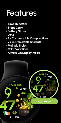 Celebrate St. Patrick's Day with a stylish watch face featuring shimmering gold coins 💰, a rich emerald color scheme 🍀, and lucky shamrocks ☘️.